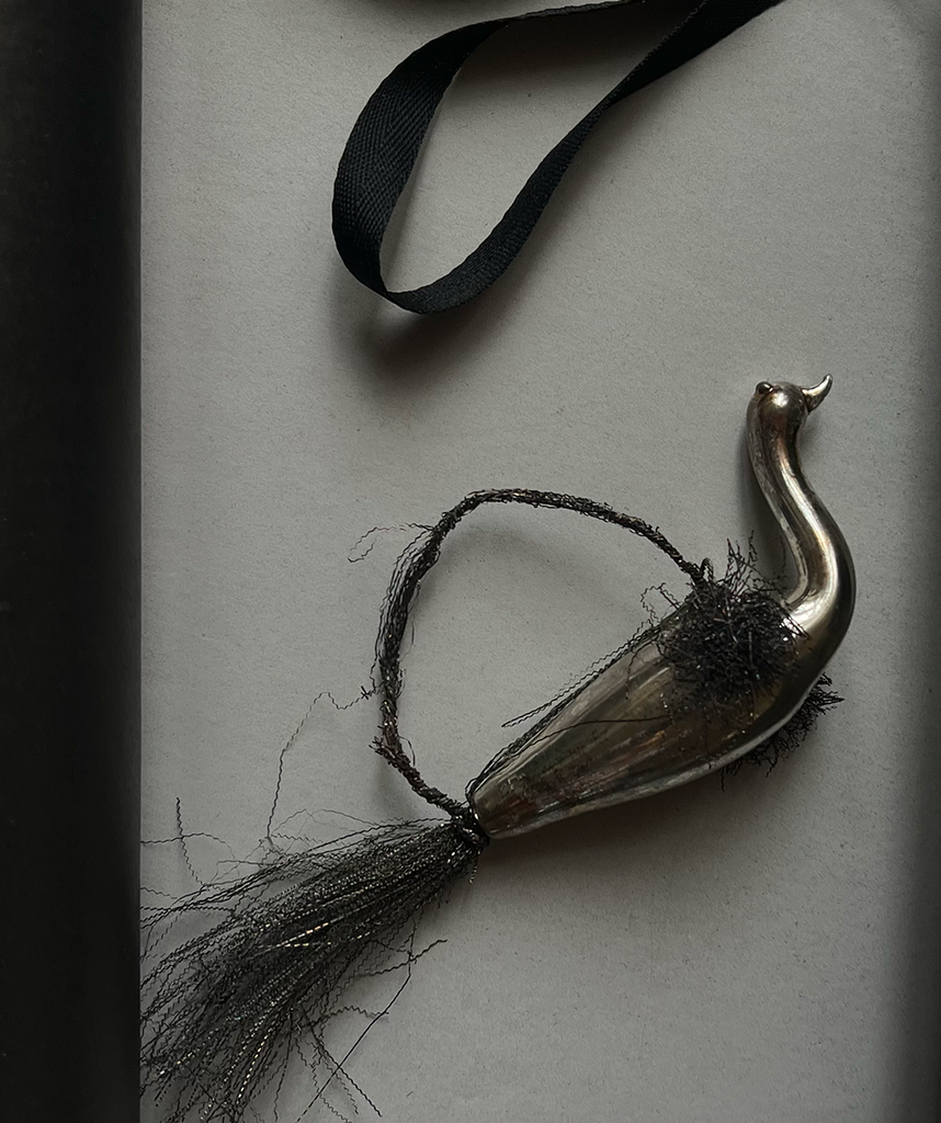 En mundblæst glasfugl med fine glitrende detaljer, der tilfører juletræet tidløs elegance.