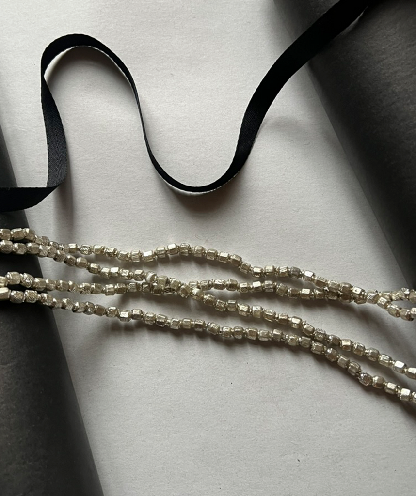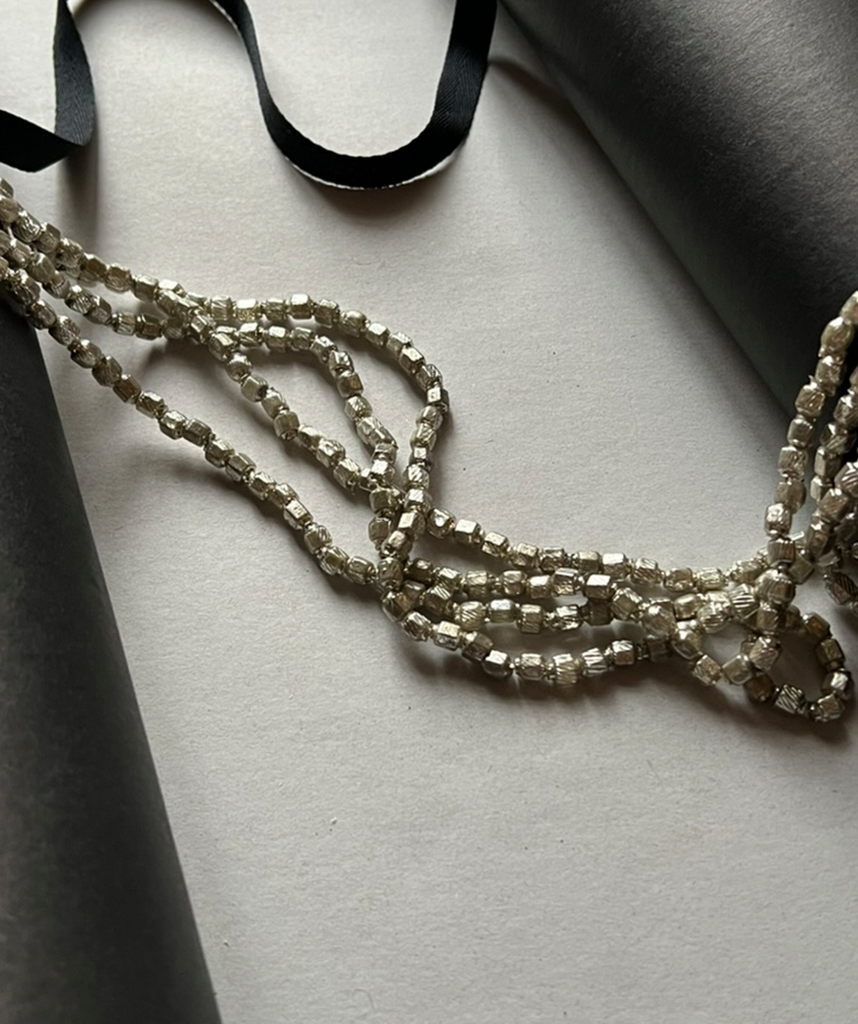 Denne unikke 3 meter lange kæde har fine sekskantede perler i en forsølvet farve. Perfekt til at pynte juletræet eller som en tilføjelse til julens borddekorationer.