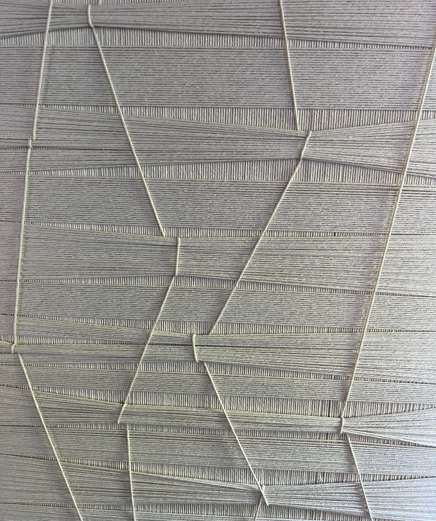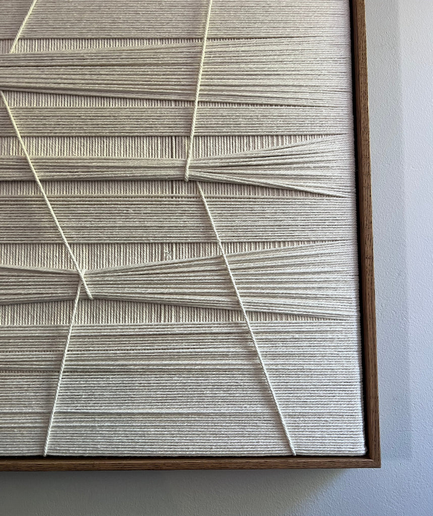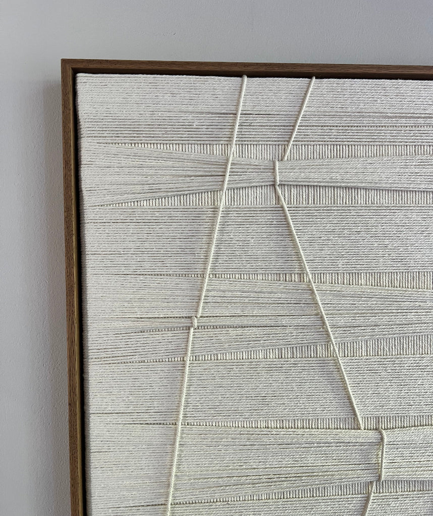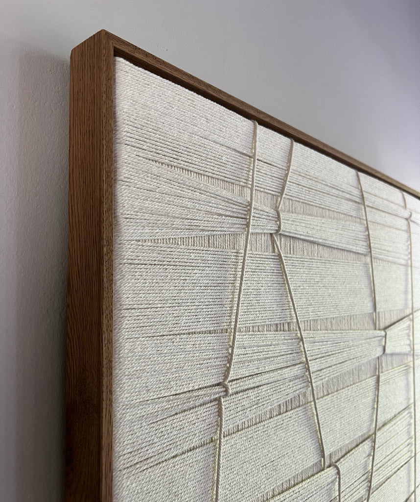 No. 01 er et smukt og minimalistisk kunstværk i snor. Kunstværket er indrammet i en brun ramme i olieret egetræ, som tilføjer en tidløs og organisk ro til hjemmet.