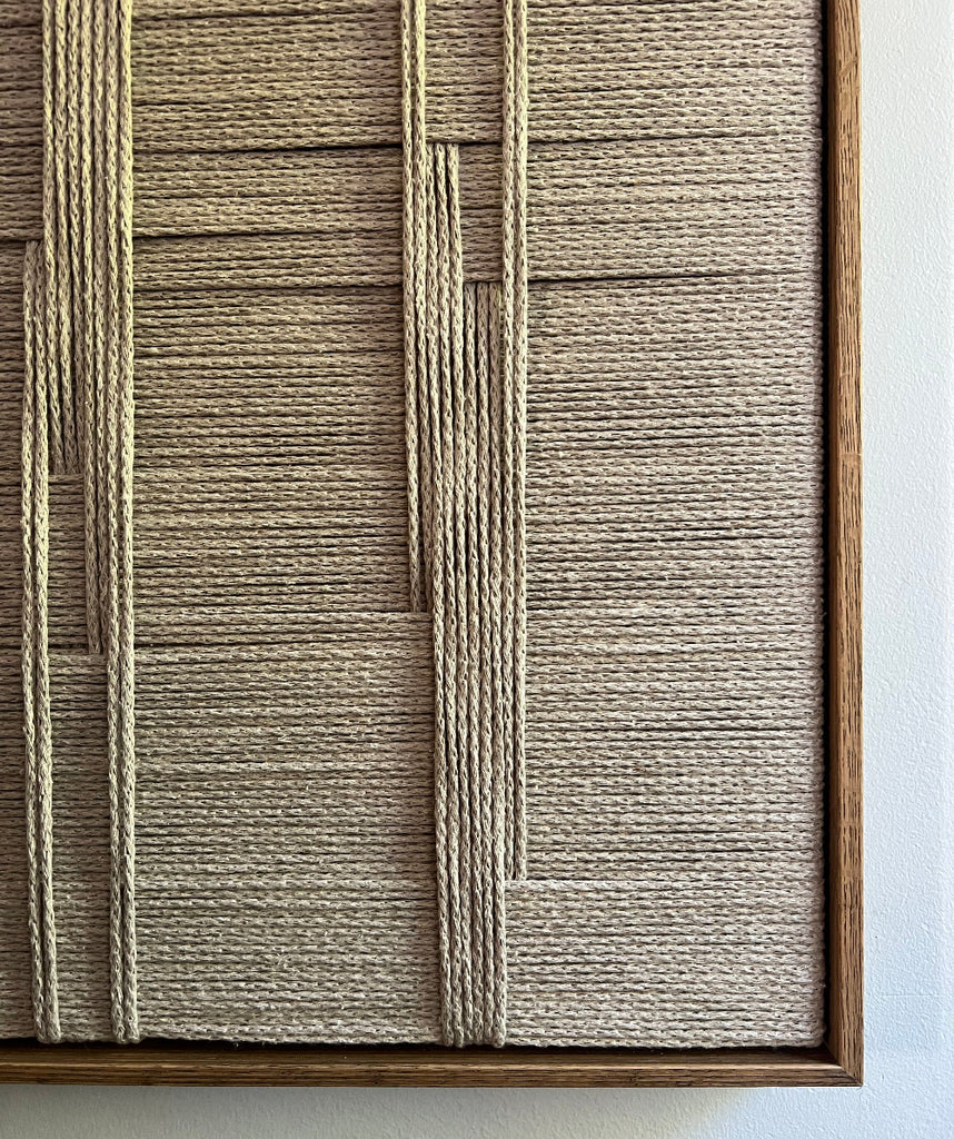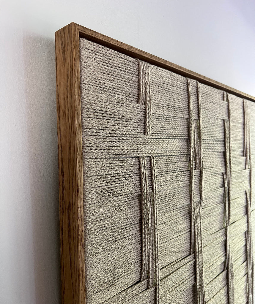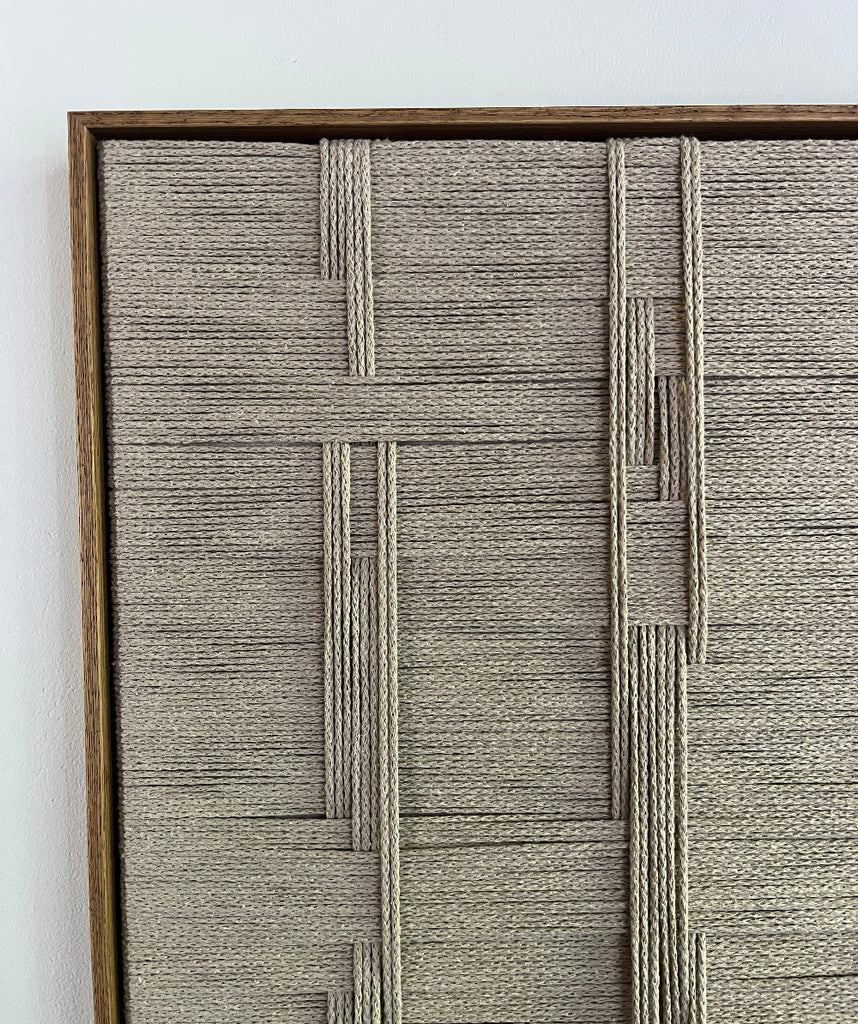 No. 02 er et smukt og minimalistisk kunstværk i snor. Kunstværket er indrammet i en brun ramme i olieret egetræ, som tilføjer en tidløs og organisk ro til hjemmet.