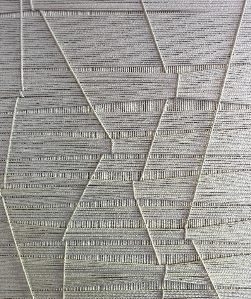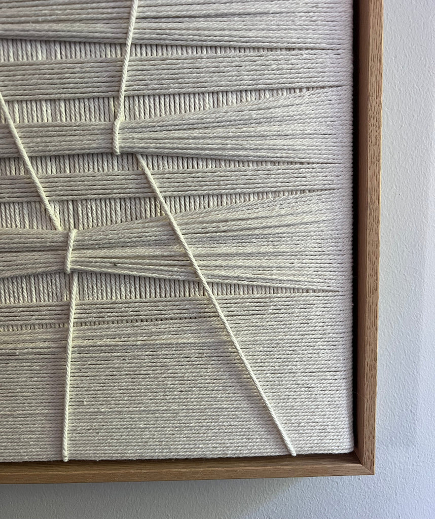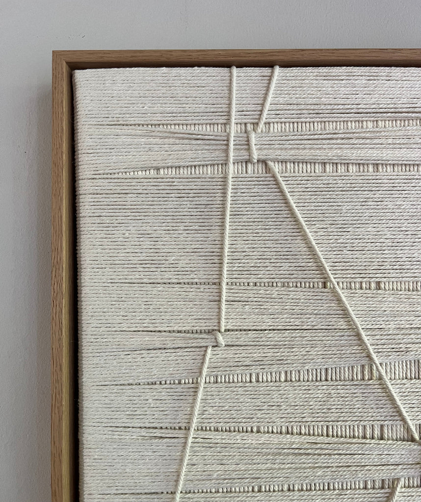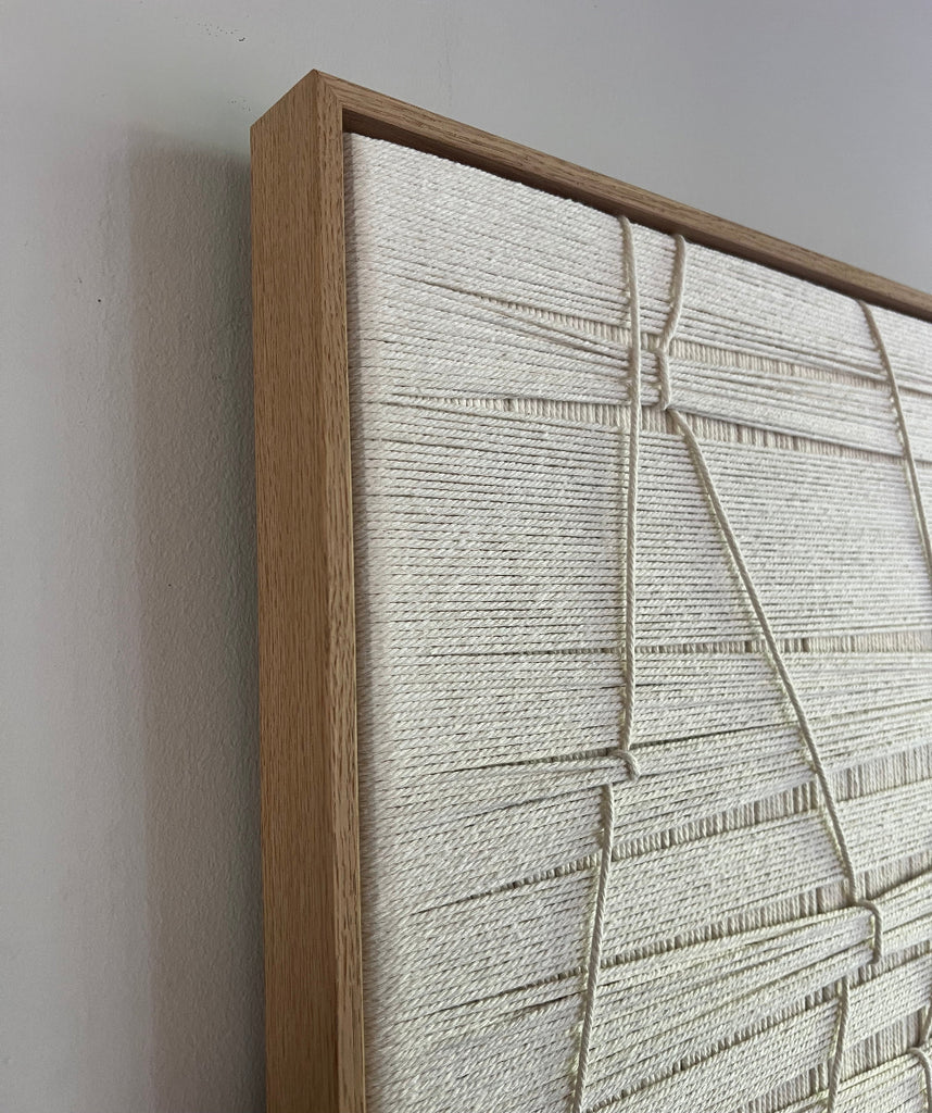 No. 09 er et smukt og minimalistisk kunstværk i snor. Kunstværket er indrammet i en lysebrun ramme i olieret egetræ, som tilføjer en tidløs og organisk ro til hjemmet.