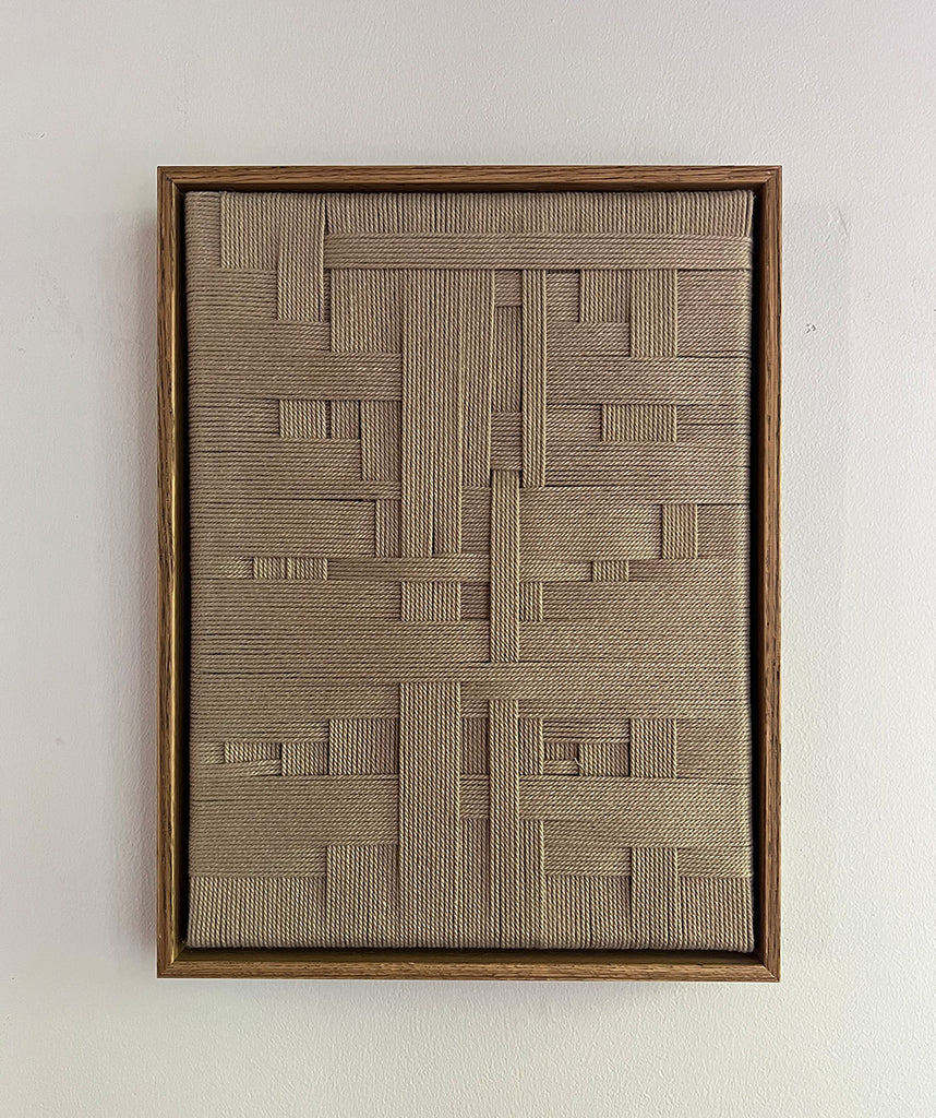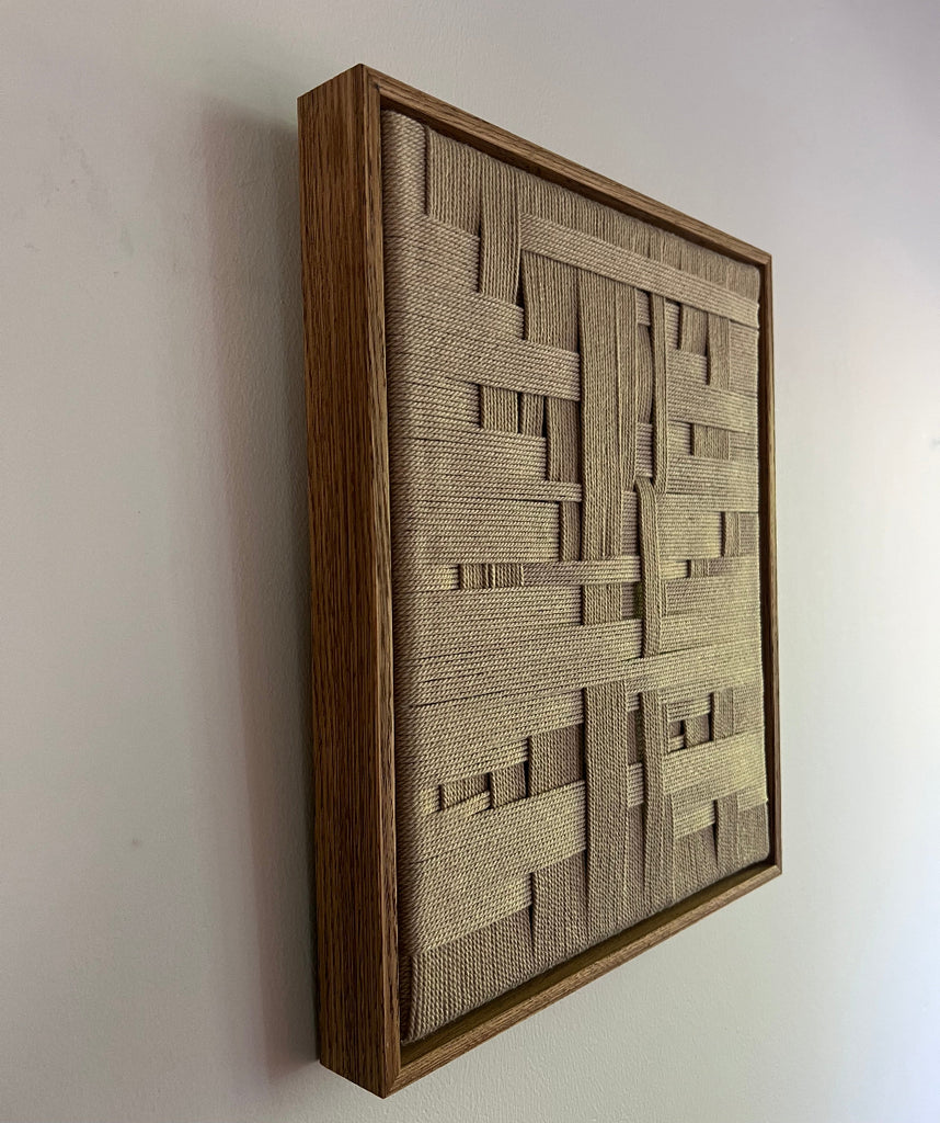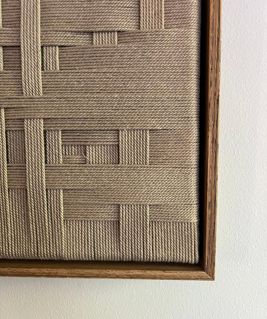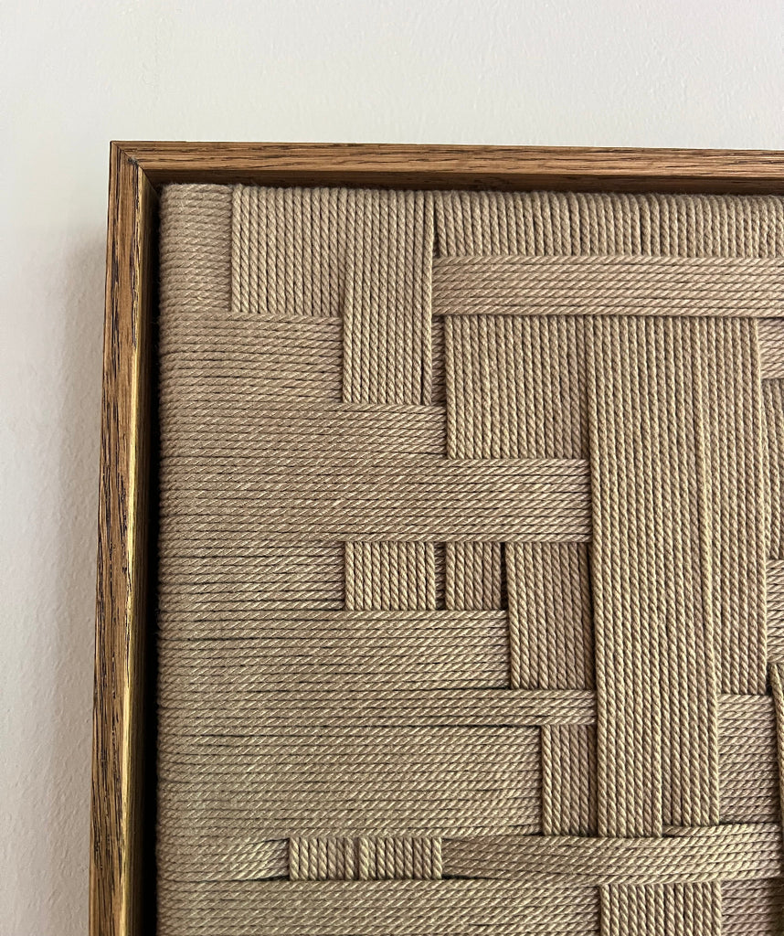 No. 10 er et smukt og minimalistisk kunstværk i snor. Kunstværket er indrammet i en brun ramme i olieret egetræ, som tilføjer en tidløs og organisk ro til hjemmet.