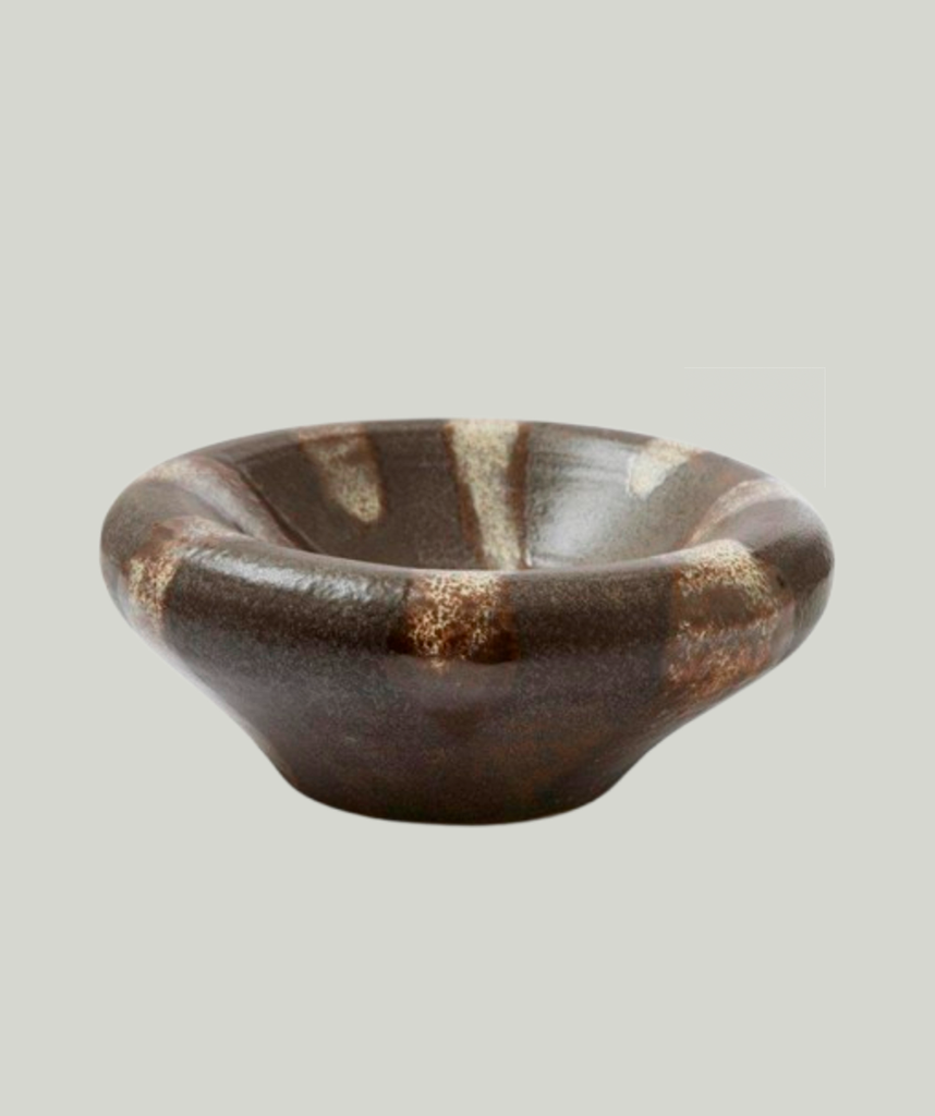 Dekorativ stentøjsskål i brun med hvide detaljer.