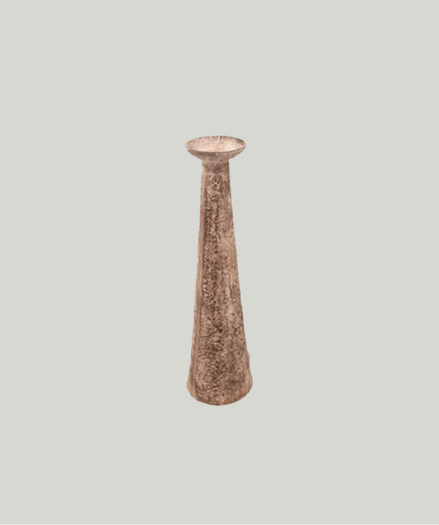 FAKEL lysestagen udstråler en robust og rustik charme takket være dens unikke, varierede finish. Lysestagens nuance og det materialebarkede udtryk giver en varm og jordnær atmosfære – perfekt til hjem, der favner en rå, nordisk eller boheme-inspireret indretning. Den er ideel til både hyggeligt lys i stuen, romantisk stemning på middagsbordet eller som dekorativ højdepunkt i en stilleben. Dens højde gør den især velegnet til bloklys, hvilket skaber et flot spil af lys og skygge.