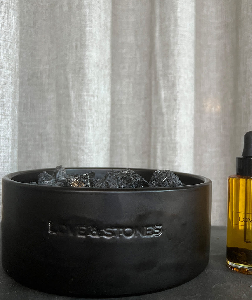 Den medfølgende 50 ml. olie dryppes over stenene og lader duften sprede sig naturligt – perfekt til meditation, afslapning eller som et raffineret element i hjemmet.